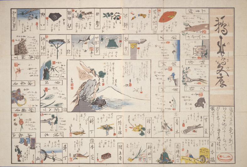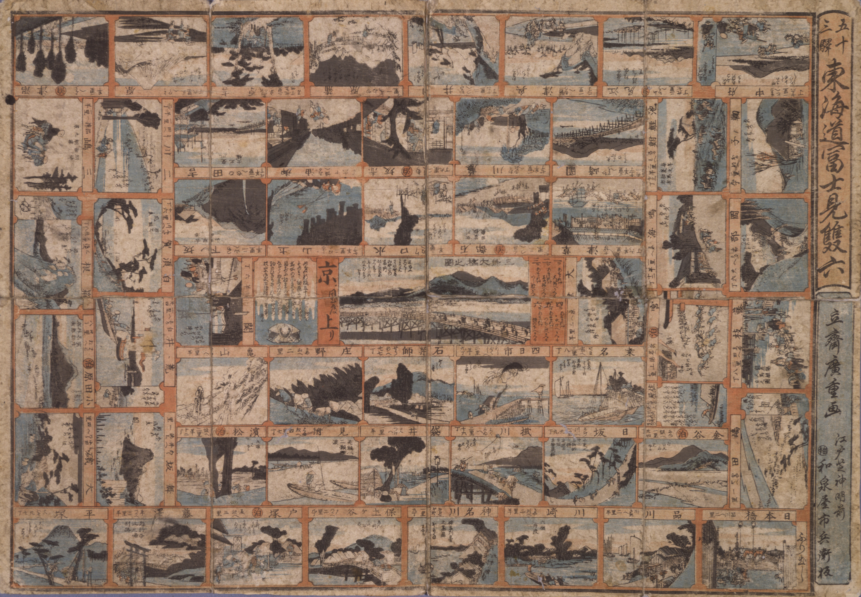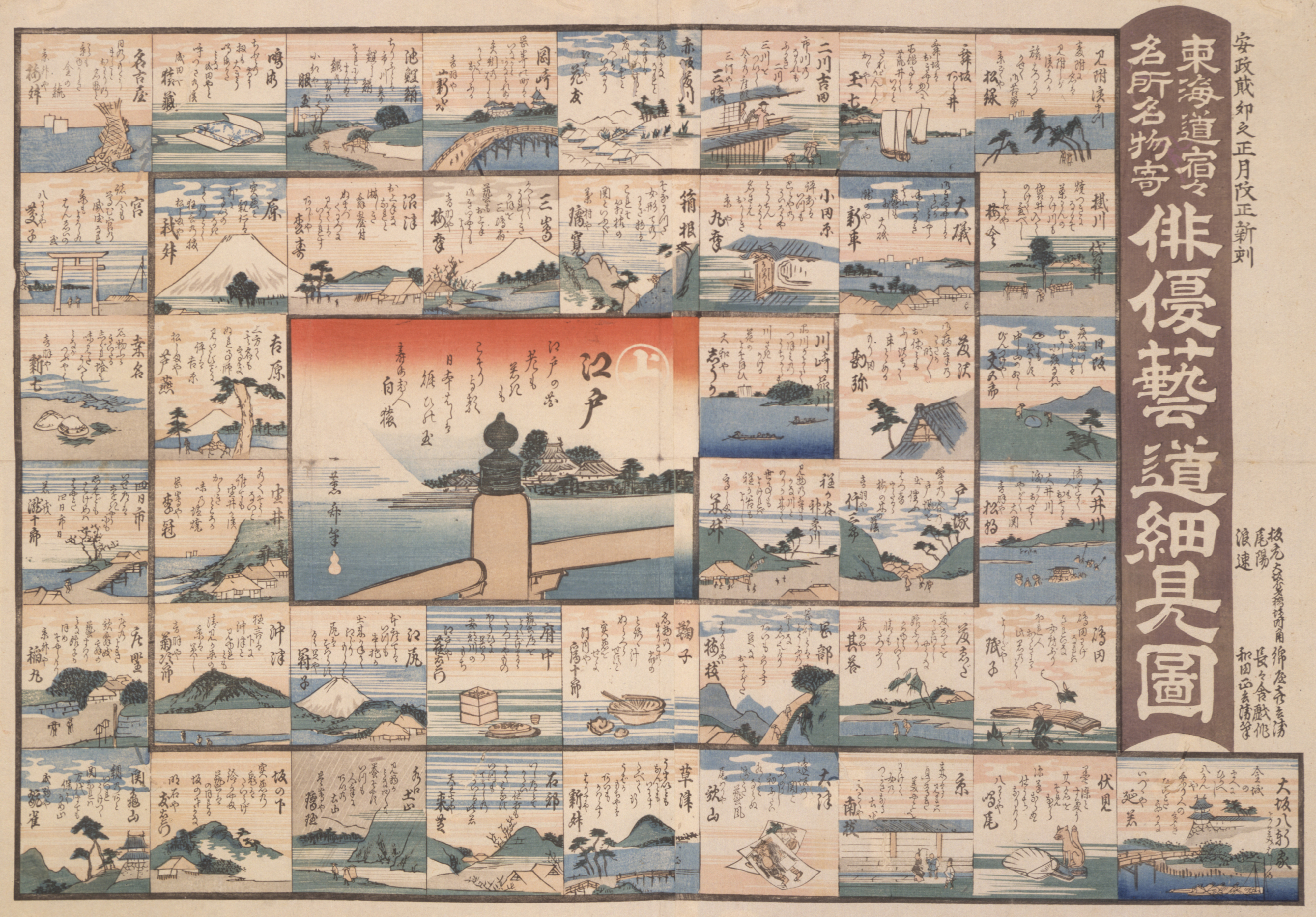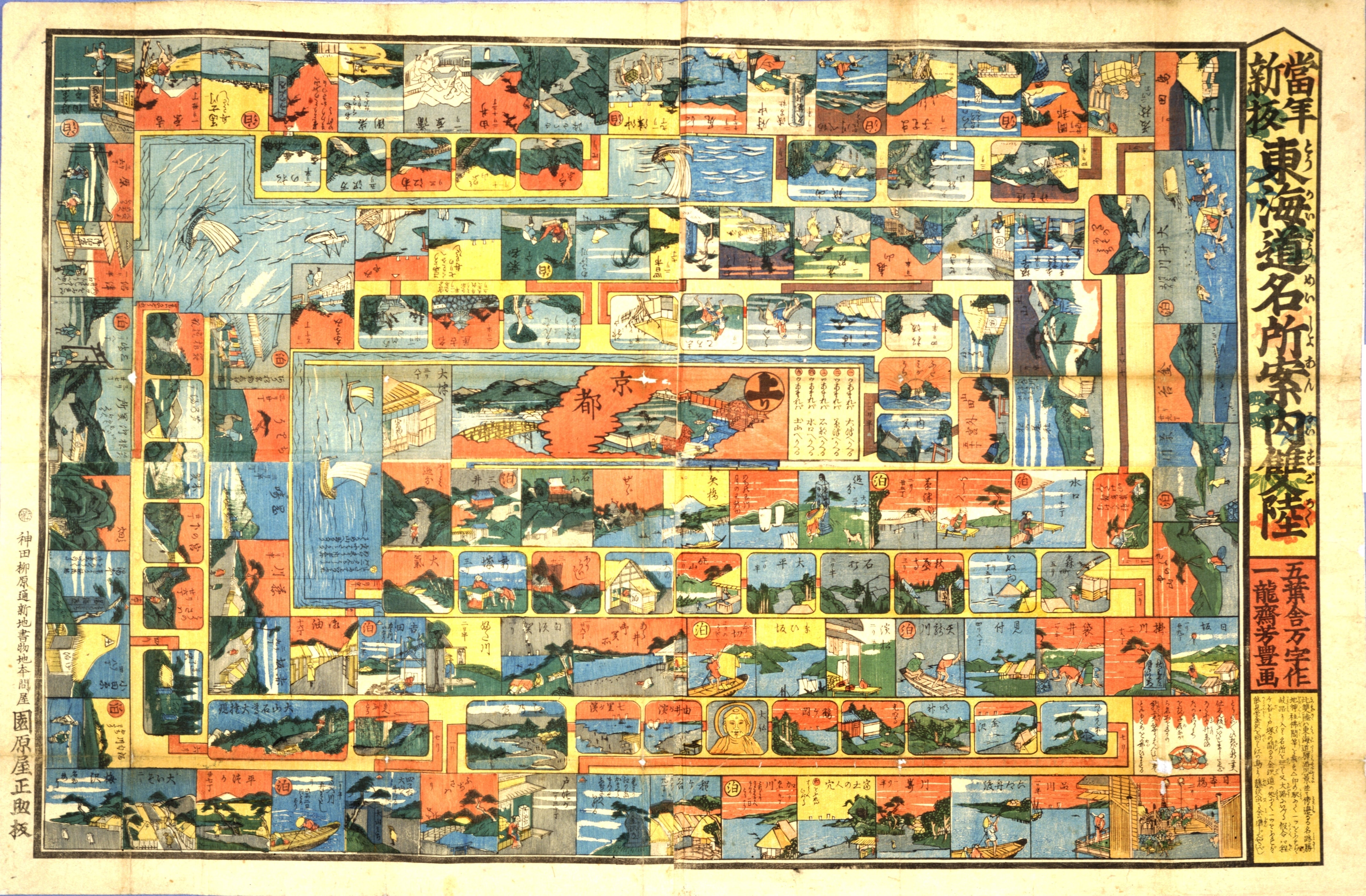 HOME LisLista de explicaciones de los materiales expuestos Lista de explicaciones de los materiales expuestos 5.Juego de tablero Sugoroku de la vista al Monte Fuji de la serie Las cincuenta y tres estaciones de Tokaido Utagawa Hiroshige 6.Sugoroku Board Game of Perambulating along the Toukaidou Utagawa Hiroshige 7.Juego de mesa Sugoroku con imágenes detalladas de lugares famosos y especialidades a lo largo de la carretera Tōkaidō, con poemas de actores Yoshiiku Ochiai 8.Juego de mesa Sugoroku de viaje por las cincuenta y tres estaciones del Tōkaidō a través de la poesía Totoya Hokkei 9.Juego de tablero Sugoroku del disfrute de las cuatro estaciones del año unknown 14.Juego de mesa Sugoroku: Viajes por santuarios, templos y lugares famosos según Iroha Utagawa Hiroshige 19.El juego de mesa Sugoroku de la Visita Imperial unknown 20.El juego de mesa Sugoroku de las Cincuenta y Tres Estaciones de la Carretera Toukaidou Utagawa Kuniteru 21.Recorriendo lugares famosos de Japón con el juego de mesa Sugoroku Utagawa Yoshitsuya 22.Juego de Sugoroku de las Sesenta y tantas provincias de Japón Utagawa Hiroshige II 23.El juego de mesa Sugoroku: Viaje a Kioto a través de la peregrinación al Santuario de Ise Utagawa Hiroshige 26.Isla de Enoshima, de la serie “Los lugares famosos de los Toukaidou” Utagawa Sadahide 29.Futagawa, Ishikawa Tomoichi, de la serie Las cincuenta y tres estaciones de Tōkaidō Utagawa Kunisada (Toyokuni III) 32.Las siete deidades de la buena fortuna en un barco con la letra de la canción Boating Utagawa Sadahide 38.Fukurokuju, de la serie “Poemas e Imágenes de los Siete Dioses de la Buena Fortuna” Utagawa Kunisada (Toyokuni III) 46.Juego de mesa Sugoroku con coches populares Utagawa HiroshigeIII 62.Juegos de mesa Sugoroku de lugares famosos de todo el mundo Ozeki Toyo 65.Juego de mesa Enoshima Sugoroku unknown